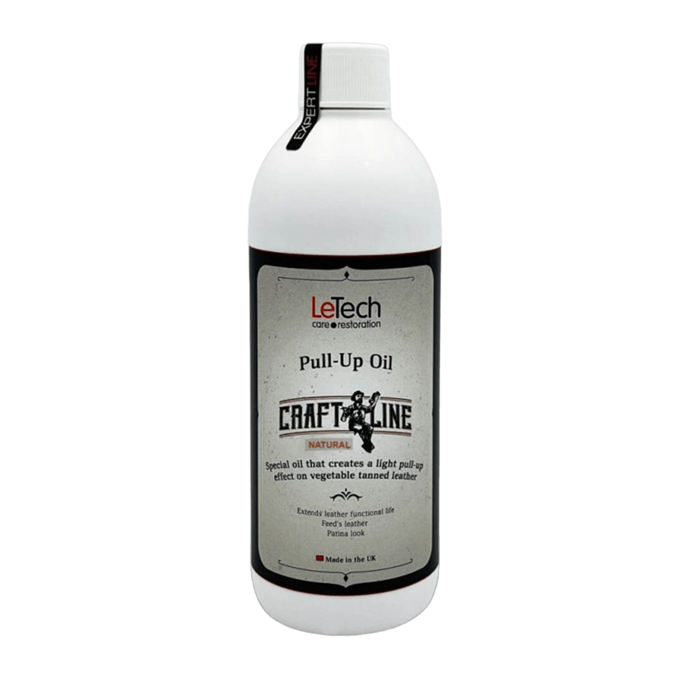 The Pull-Up Oil is a composition of high-quality oils that feed leather, making it soft and elastic and giving it an old patinated appearance. The product can also be used to create a strong tinting effect on vegetable-tanned leather. After the application of the Pull-Up Oil, the leather surface gets a soft wax feel.